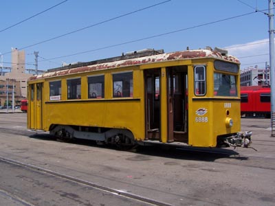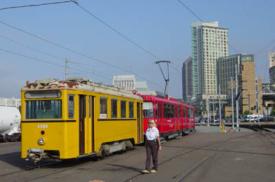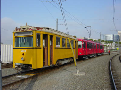 San Diego Trolley Car 1067 pulls Vienna Car NH 6888 towards a track with