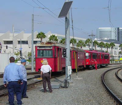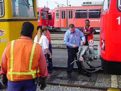 San Diego Trolley workers prepare to couple Car NH 6888 from Vienna, Austria to